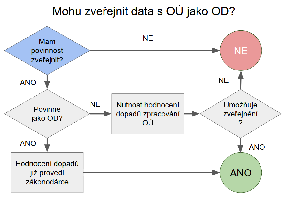 Tuto otázku je tedy možné shrnout tak, že poskytování otevřených dat, které obsahují osobní údaje je možné pouze tehdy, pokud se jedná o zveřejňování, které správci ukládá zákon, nebo ke kterému je zákonem zmocněn. Ze stanoviska Pracovní skupiny WP 29 (nyní Evropský sbor pro ochranu osobních údajů) vyplývá, že před zveřejněním takových informací v podobě otevřených dat je třeba provést zhodnocení dopadů tohoto zveřejnění na subjekty údajů a jejich chráněná práva. Vzhledem k tomu, že poskytování osobních údajů jako otřevřených dat je možné pouze na základě zákonného zmocnění, musí toto zhodnocení proběhnout na úrovni zákonodárce, který jednoznačně stanoví povinnost poskytovat některé informace jako otevřená data (například prostřednictvím nařízení vlády č. 425/2016 Sb., o seznamu informací zveřejňovaných jako otevřená data). Navrhovaný zákon o zpracování osobních údajů v § 10 navíc výslovně uvádí, že správce údajů nemusí provádět posouzení vlivu zpracování na ochranu osobních údajů před jeho zahájením, pokud mu právní předpis stanoví povinnost takové zpracování osobních údajů provést.